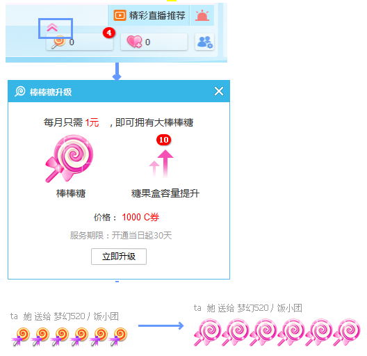用户可以升级自己的糖果为更酷炫的大号糖果。