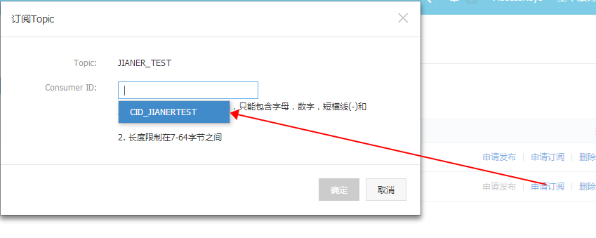 點擊申請訂閱,填寫接收方的Consumer ID。此ID為全局唯一,用於標識接收方。名字以CID_開頭,後麵隨意,滿足規則即可。一個CID表示一組機器,一條推送隻會被一組機器裏麵的其中一台機器消費。
