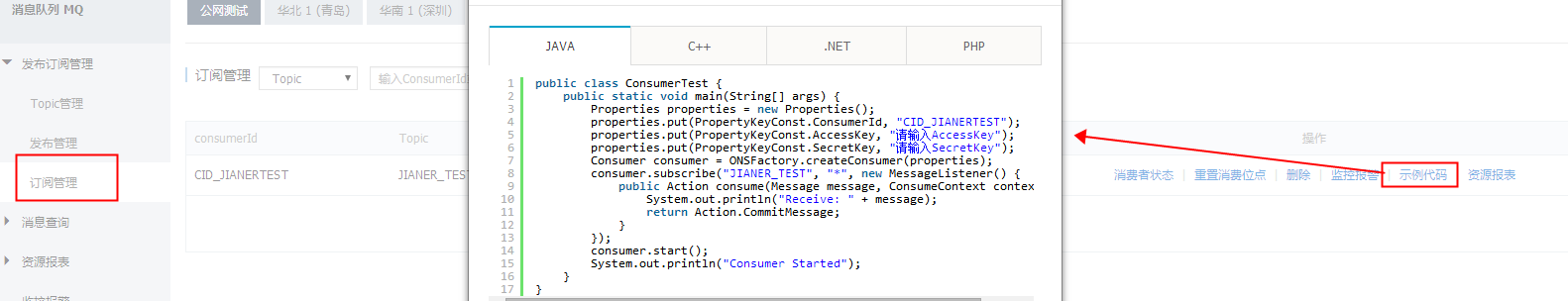 點擊訂閱管理,可以看到訂閱關係已經創建好了。參考示例寫代碼。